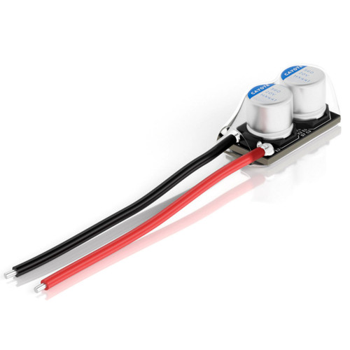 Featuring dual 560uF/20V low ESR capacitors, this external unit helps minimize voltage ripple and suppress harmful spikes generated during rapid throttle inputs. The low ESR design improves efficiency and supports smoother power output to the motor system. Pre-wired with 18AWG leads and a compact 72mm length, it offers easy integration into most setups without adding unnecessary bulk. Ideal for high-performance applications, it adds an extra layer of protection and stability to your ESC system.